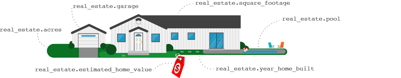 real_estate.ac_type- The type of air conditioning used to cool the home.real_estate.acres- The size of the property in acres.real_estate.assessor_parcel_number- A unique ID for the real estate property.real_estate.basement_square_footage- The size of the basement in square feet.real_estate.building_size_code- The source used to populate building square footage.real_estate.building_square_footage- The size of the building in square feet.real_estate.construction_quality- The type of costruction quality used on the home.real_estate.construction_type- The type of construction used to build the home.real_estate.construction_type_detail- The detailed type of construction used to build the home.real_estate.electric_wiring_type- The type of electrical wiring in the home.real_estate.estimated_home_value- An estimate of the current home value.real_estate.exterior_wall_type- The type or finish of the exterior walls of the home.real_estate.fireplace- Indicates the presence of a fireplace in the home.real_estate.fireplace_type- The type of fireplace in the home.real_estate.foundation_type- The type of foundation of the home.real_estate.garage- Indicates the presence of a garage on the property.real_estate.garage_square_footage- The size of the garage or parking area in square feet.real_estate.gross_square_footage- The size of the building in square feet.real_estate.gross_square_footage_adjusted- The size of the living and non-living areas in square feet.real_estate.ground_floor_square_footage- The size of the ground floor area in square feet.real_estate.heating_type- The type of system used to heat the home.real_estate.heating_type_detail- The detailed type of system used to heat the home.real_estate.home_fuel_type- The type of fuel used to heat the home.real_estate.house_condition- The physical condition of the home.real_estate.living_square_footage- The size of the living area in square feet.real_estate.lot_size_square_footage- The size of the lot in square feet.real_estate.number_of_bathrooms- The number of bathrooms in the home.real_estate.number_of_bedrooms- The number of bedrooms in the home.real_estate.number_of_fireplaces- The total number of fireplaces in the home.real_estate.number_of_full_bathrooms- The number of full bathrooms in the home.real_estate.number_of_half_bathrooms- The number of half bathrooms in the home.real_estate.number_of_rooms- The number of rooms in the home.real_estate.number_of_stories- The number of stories associated with the home.real_estate.pool- Indicates the presence of a pool at the home.real_estate.pool_type- The type of pool at the home.real_estate.roof_cover- The type of roof covering on the home.real_estate.roof_shape- The shape of the roof on the home.real_estate.sewer_type- The type of sewer system on the property.real_estate.square_footage- The size of the home in square feet.real_estate.style_type- The type of style for the home.real_estate.water_type- The type of water service on the property.real_estate.year_home_built- The year the home was built.