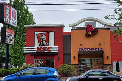 The combination of KFC and Taco Bell creates a hybrid chain location with two brands.