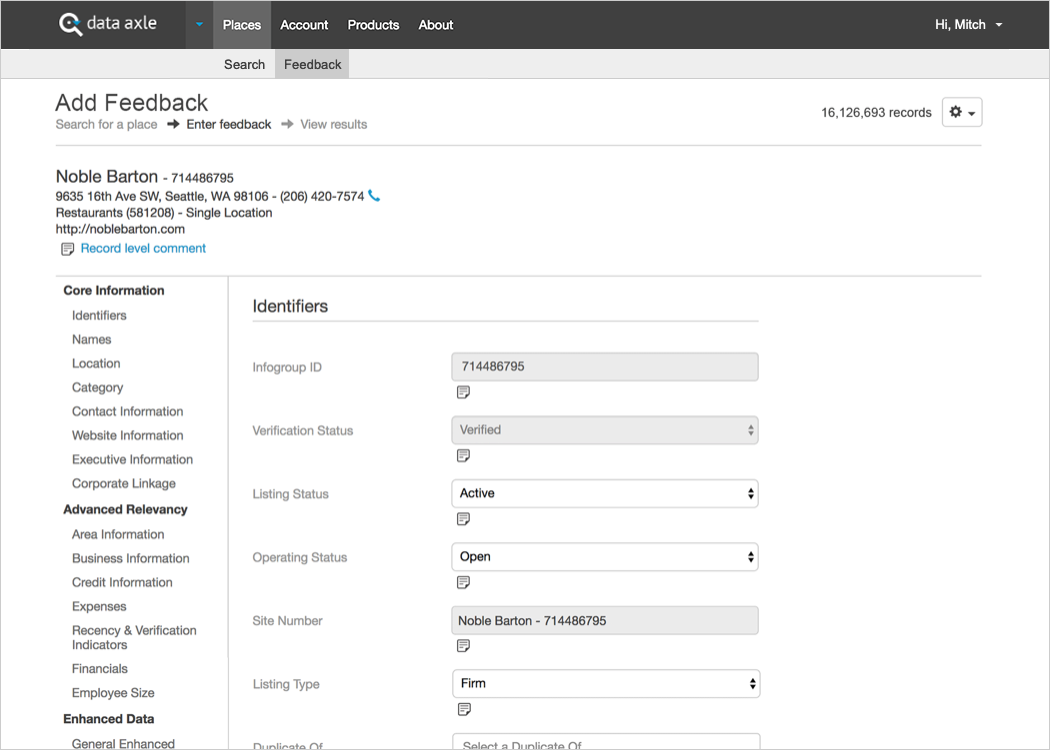 Click on a record in the Places table to drill into the details.